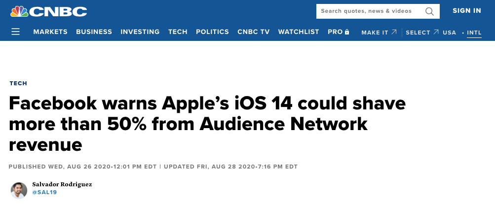 其实,背后的利益考量也挺简单:数据缺失导致广告归因和投放不精准,这种不精准又影响平台的广告资源定价能力。一个苹果隐私政策的小调整,Facebook旗下广告联盟的收入能够折损一半以上。