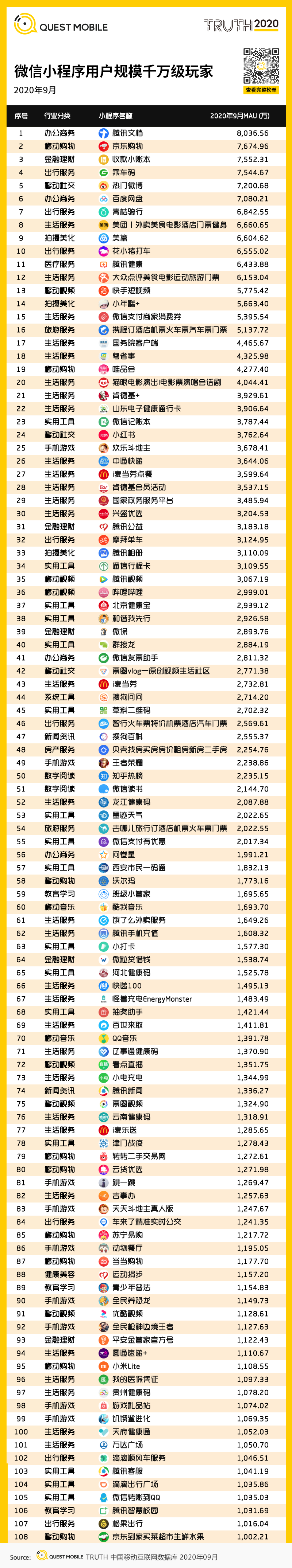 5、基于用户即时、方便的服务需求特性,微信小程序在生活、购物、办公三个行业的用户规模呈现快速增长