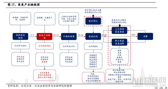 诚然,在整个医美产业链中,位于上游的医美原料制造和医美产品制造,的确是在整个行业中,毛利率较高的环节。从兴业证券的报告调研中可以发现,医美产品制造整体毛利率达到88%-90%,毛利率远远高于其他环节。和下游的医美机构相比,上游的医美产品制造产品标准化程度较高,市场集中度也较高,风险也较低。