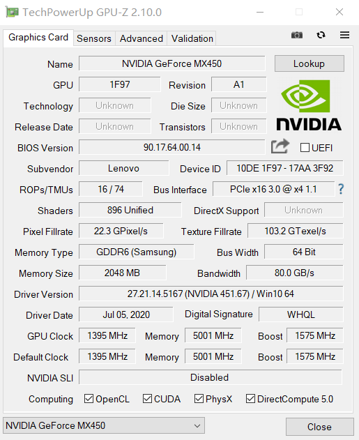 英伟达MX450显卡的推出,更是让轻薄本的性能来到了一个新纪元。这次英伟达破天荒地没有继续采用基本架构不变、增加流处理器的挤牙膏换代法,MX450基于全新图灵架构核心开发,采用GTX1650同款TU117核心,配备GDDR5/GDDR6内存,全系896个流处理器。