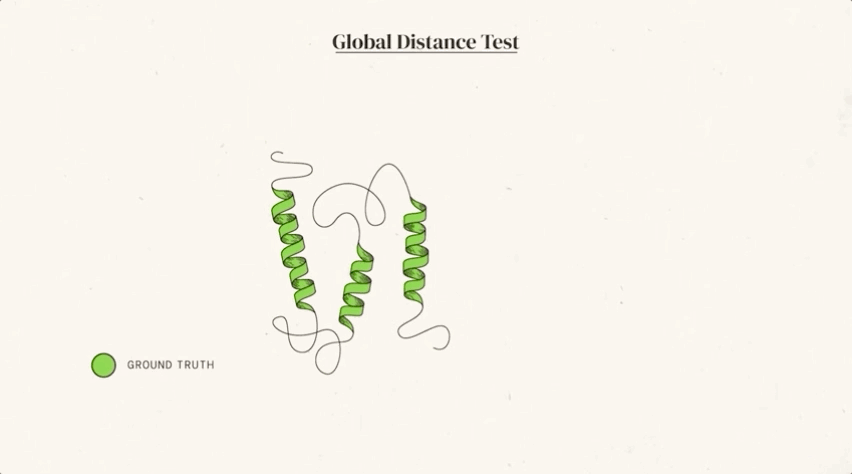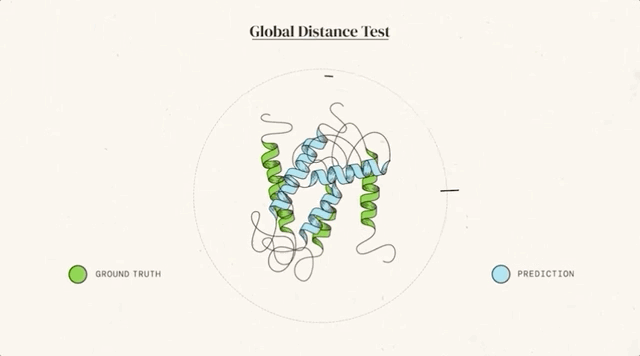 CASP 用来测量预测准确性的主要指标是 GDT(Global Distance Test ) ,其范围是从0-100。简单地说,GDT 可以大致地被认为是氨基酸残基在阈值距离内与正确位置的百分比。根据 Moult 教授的说法,90分左右的 GDT 可以被认为是与实验方法得到的结果相竞争的。