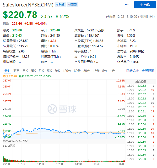 截止美股研究社发稿,Salesforce每股报229.70美元,总市值为2196.29亿美元。