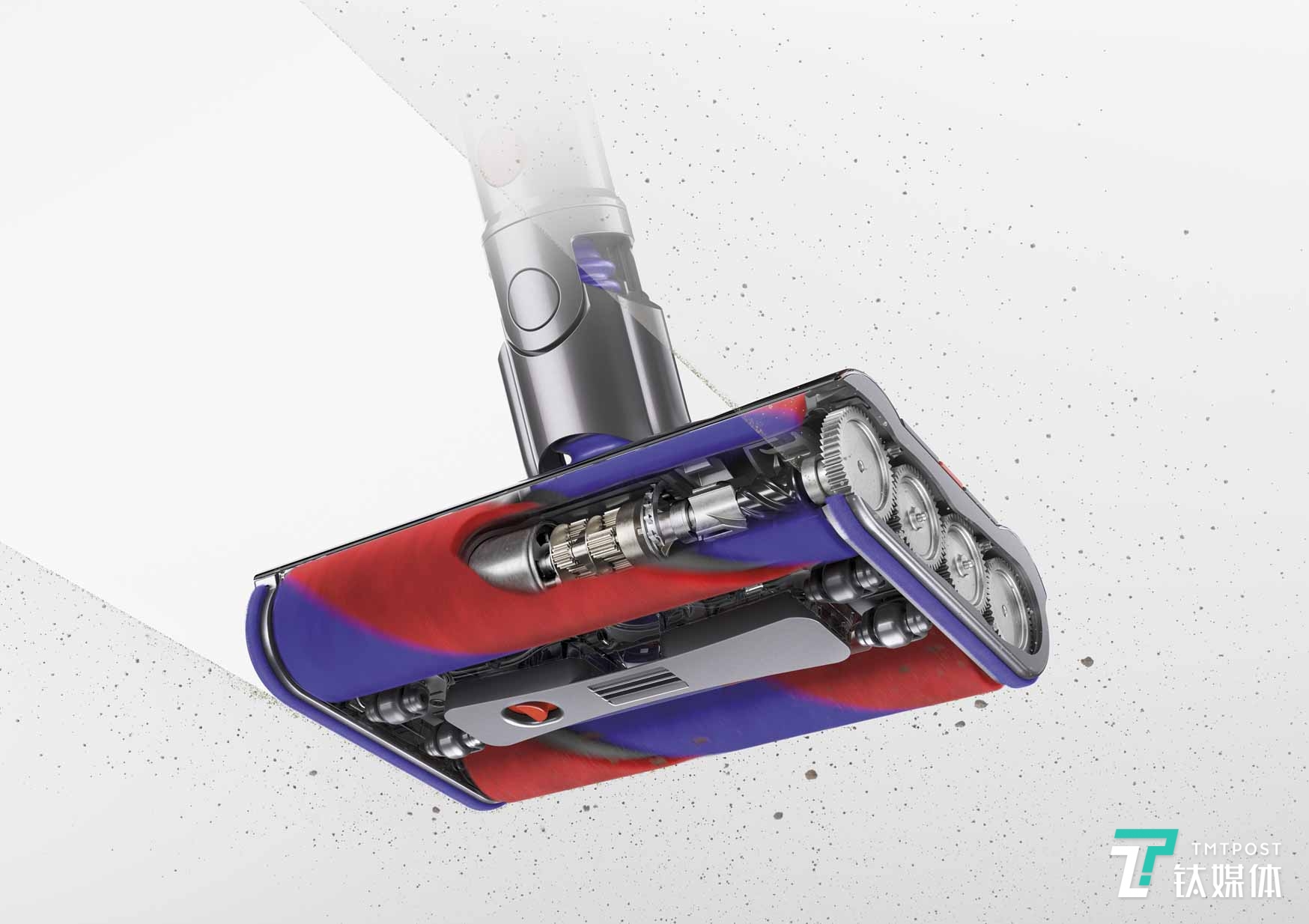 这款吸头还首次采用双刷条设计,内置的马达驱动双周转齿轮箱,让两个斜向缝制的碳纤维毛刷以相同的速度从两个方向同时吸附灰尘,确保了往前推和往后拉时吸尘效果一致,可以在同样的时间内覆盖更大的吸尘面积。