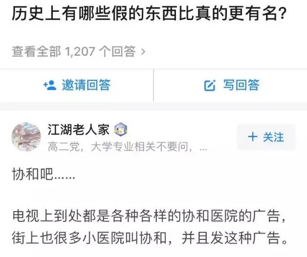 而现下,知乎上已经出现了这样的问题:“历史上有哪些假的东西,比真的更有名?”有1000多个回答说是“协和”。