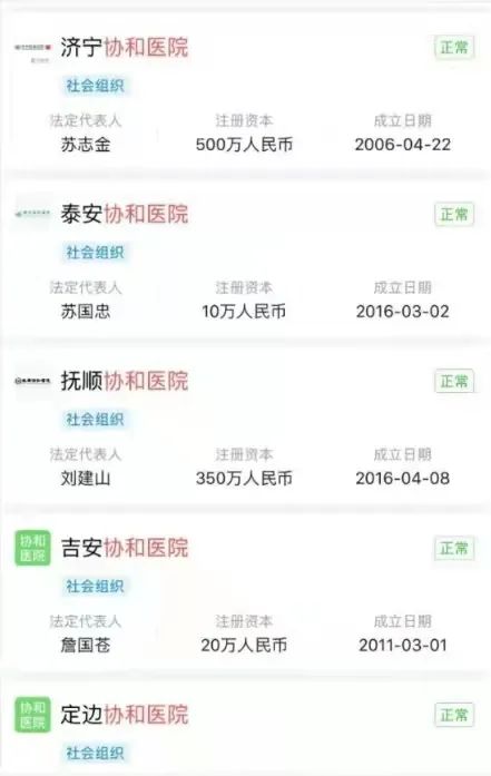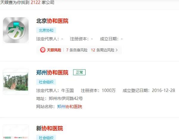但谁能想到,这年头,竟然连医院也可以是仿冒的。以“协和医院”为例,在天眼查上搜索,竟有多达2122家,其范围之广,布局之深,不管身处几线城市,不管位置多偏远,总有一家协和医院等着你。