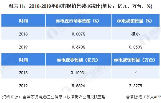 从各大品牌8K电视业务布局情况来看,夏普、Samsung、康佳、Sony、TCL、LG等都推出了8K电视产品。然而,8K电视行业发展仍处于起步阶段,整体行业规模较小,市场渗透率极低。根据全国家用电器工业信息中心的数据,2019年中国8K电视销量约2.3万台,销量占整体市场比重约0.05%;8K电视普遍价格较高,市场规模约8.59亿元,占整体市场比重约0.67%。