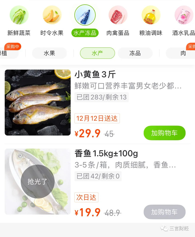 以上海地区十荟团为例,虽然显示能购买的各种商品类别很多,但每一项最多也就不超过20种;有的像水产之类就两款,买晚了还会被抢光。