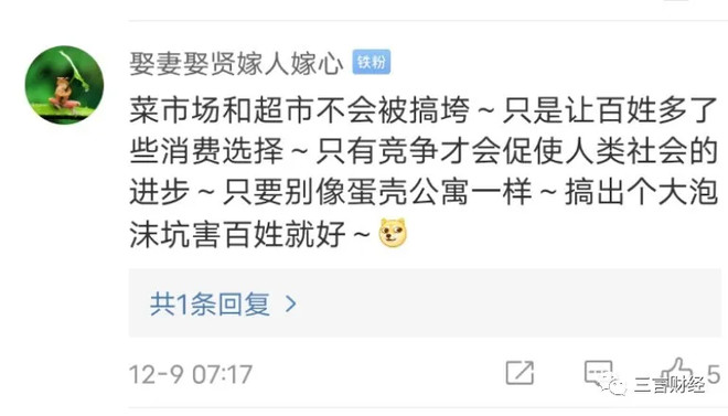 也有网友有不同见解,认为菜市场和超市不会被搞垮,只是让百姓多了些消费选择,只有竞争才会促使人类社会的进步,只要别像蛋壳公寓一样,搞出个大泡沫坑害百姓就好。