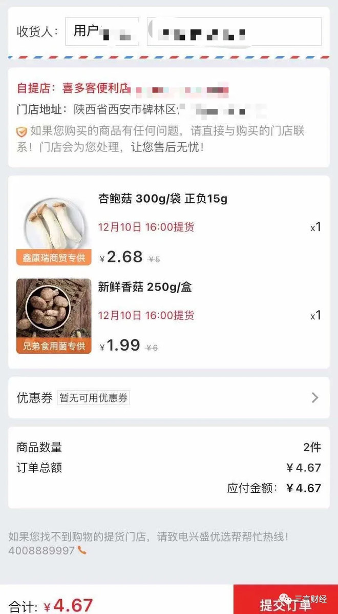 三言财经于12月9日同样在兴盛优选上下单购买了杏鲍菇和香菇。而这一次,三言财经选择的提货点是一家小超市。