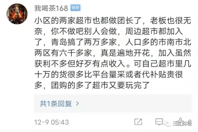 有网友称,小区的两家超市也都做团长了,老板也很无奈,你不做别人会做,周边超市都加入了,青岛搞了两万多家,人口多的市南市北两区有六千多家,真是遍地开花,加入虽然获利不多但好歹有点收入。可自己超市里几十万的货很多比平台量采或者代补贴贵很多,团购的多了超市又要玩完了。