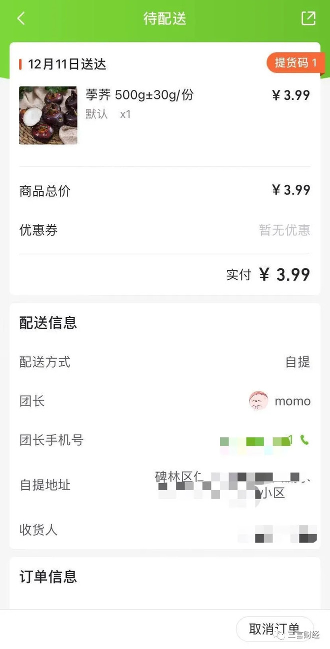 三言财经选择的提货地点是测试地所在的小区门口,负责送货的团长会在送到后致电用户。