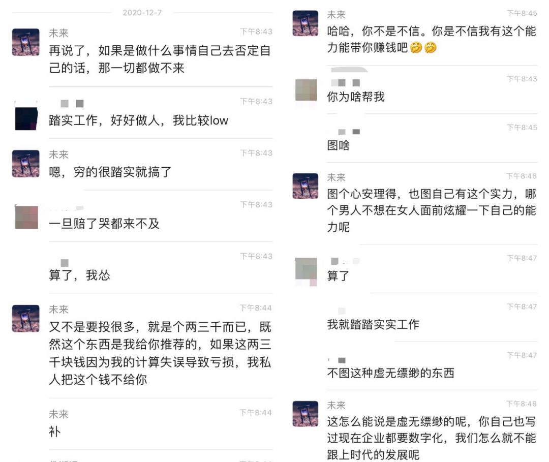 新认识的这个男生,说能带着何米投资赚钱,先从小单赚起,后来要赚笔大的,何米的钱不够,那个男生还推荐给她一个网贷平台,从上面借了两万多,之后那个男生就失联了。何米为此消沉了很久,同时面临着还款压力,几个月都省吃俭用。