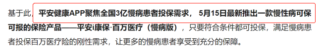 日常预防险种之外,平台还延伸了细分险种。2020年5月,平安好医生推出针对慢性病可报的保险产品,是医疗服务更具适用性的升级。