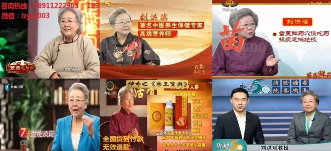 电视广告的生猛发展,也让禁播违规广告充斥着电视荧幕。其中最著名的一个事件就是,“刘洪滨(斌)老大妈”一人扮演“苗医鲜药传承人”、北大专家、老苗医传人、蒙医传人、中华医学会镇咳副会长、东方咳喘研究院副院长等九种专家身份,活跃于20多个电视台,拍摄各种假药广告,被网友戏称其为兢兢业业的假药广告表演艺术家。