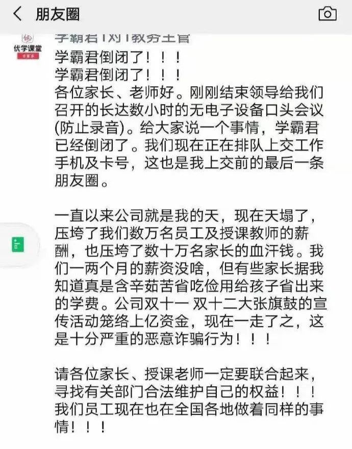 12月27日,一张“学霸君要倒闭了”的朋友圈截图传遍教育圈。