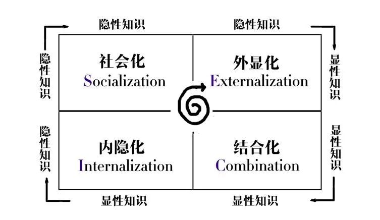 社会化(Socialization)、外显化(Externalization)、结合化(Combination)、内隐化(Internalization)。四种活动在组织内部不断交互进行,形成了“知识转移螺旋”。