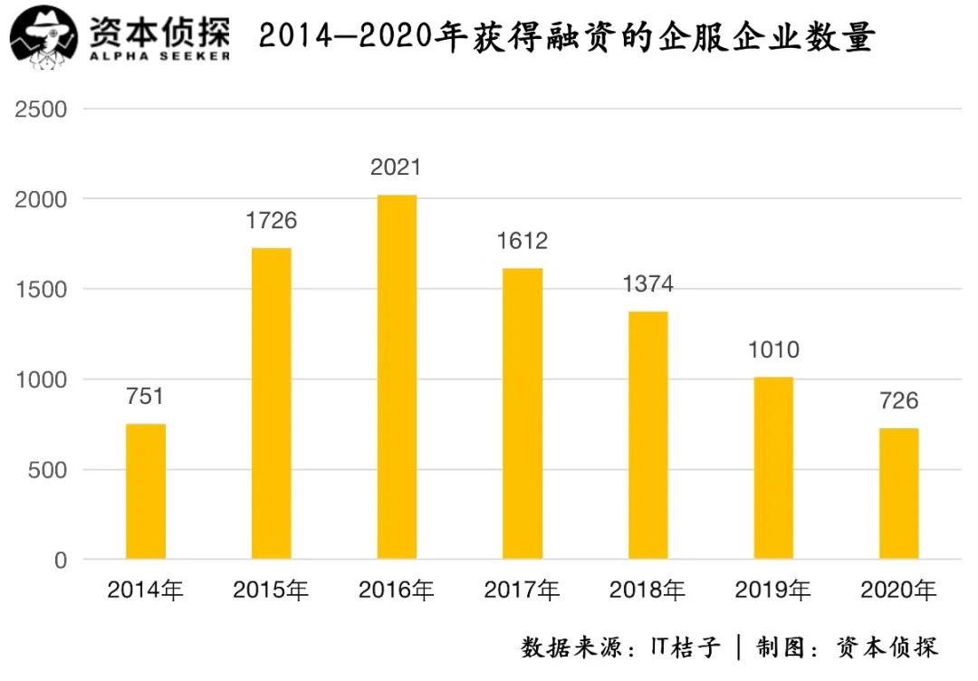 「资本侦探」统计七年的数据发现,从2014年到2020年,获得投资的企业服务企业数量有一个过山车式的变化,获得融资的企业从2014年的751家,上升到2016年的顶峰2021家,后迅速下降至2020年的726家。
