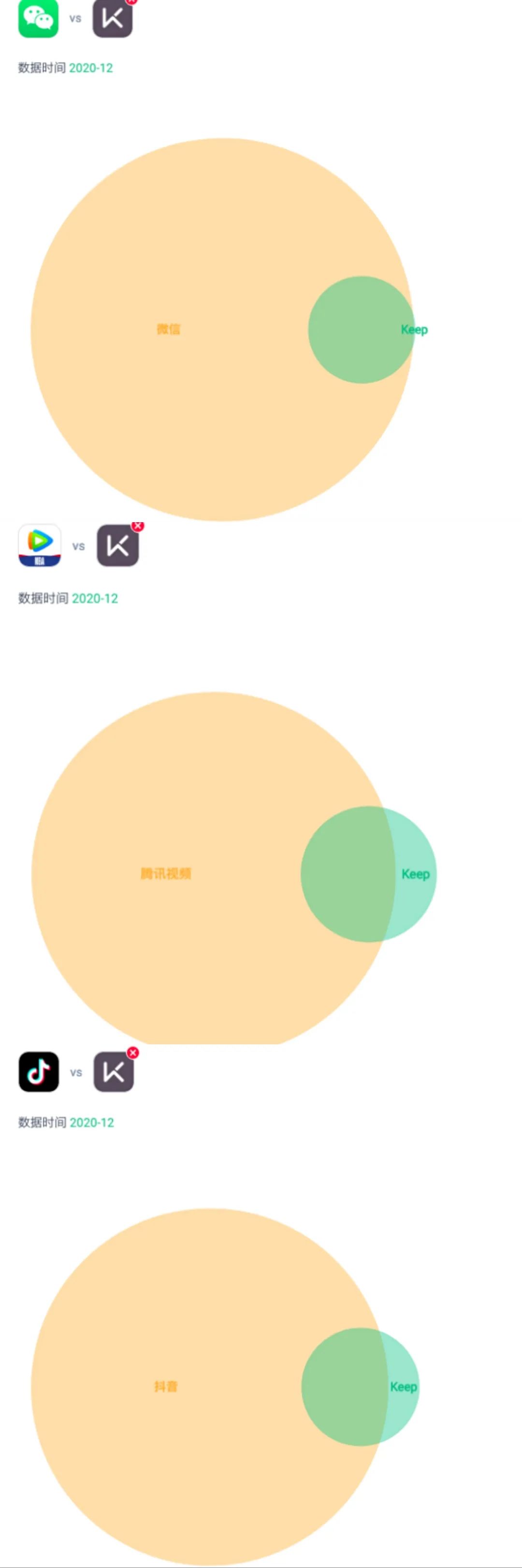 仅选取微信、抖音和腾讯视频作为示例,可视化对比流媒体和Keep用户的重合情况,垂直类产品对标国民应用,怎么看都是被淹没其中。