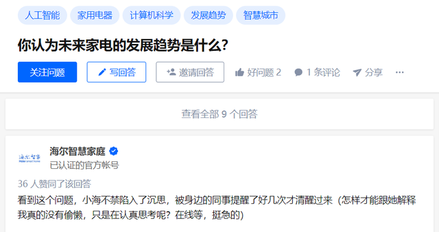知乎上有个问题,“你认为未来家电的发展趋势是什么?”引来了海尔的官方账号现身回答,并举了三点预判:家居的智能化、家电的物联网化、家电的自适应进化。