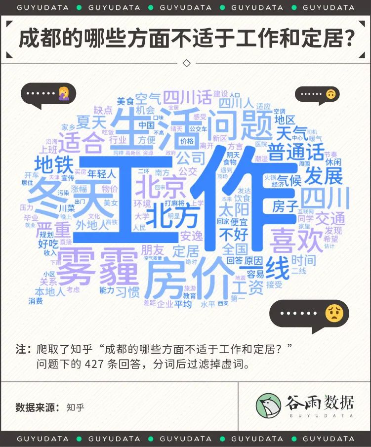 工作也同样是被提及最多的词语之一。当北上广深的年轻人们真正下定决心来到成都,会发现无论从岗位数量、薪资还是发展前景来讲,成都都无法承接他们的期望。