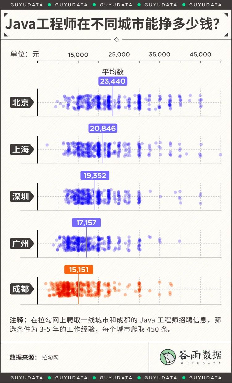结果显示,同为3-5年经验的Java工程师,如果你在成都,平均薪资只有15k,远低于20k以上的北京和上海。