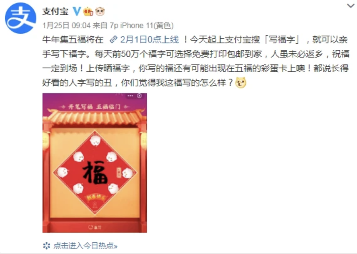 虽然集五福已经成为了一项传统,但“写五福,免费送”活动的推出,还是让不少用户为之疯狂。在微博上,支付宝写福话题的阅读量已经超过3亿,不少用户纷纷晒出自己和长辈写出的福字。