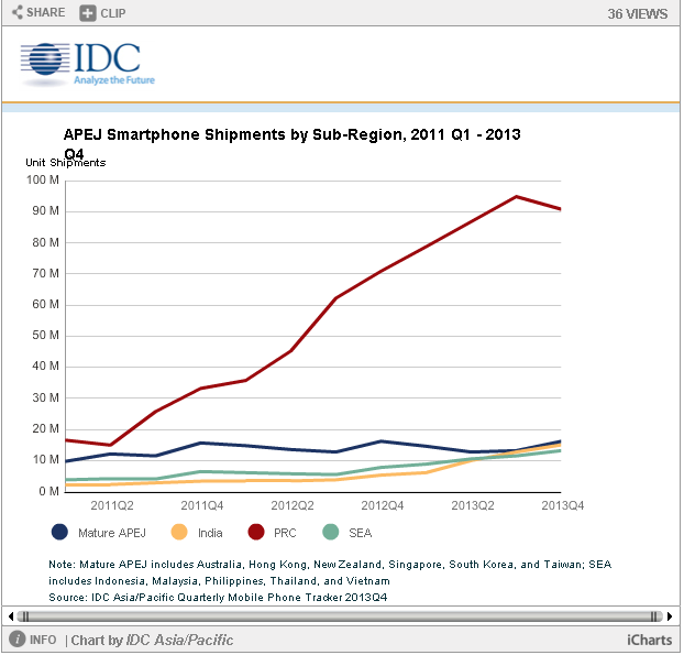这一趋势也体现在了智能手机上,中国智能手机出货比率从2013年的73%飙升到2014年的86%,这其中既有像iPhone 6这种大屏品牌手机提振销量,又有小米、红米等性价比手机吞噬市场。一个迅速扩大的蛋糕,摆在了阿里巴巴等互联网厂商的面前。