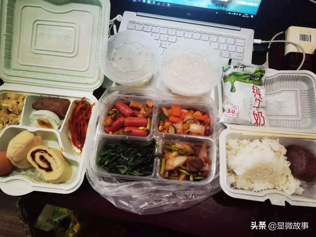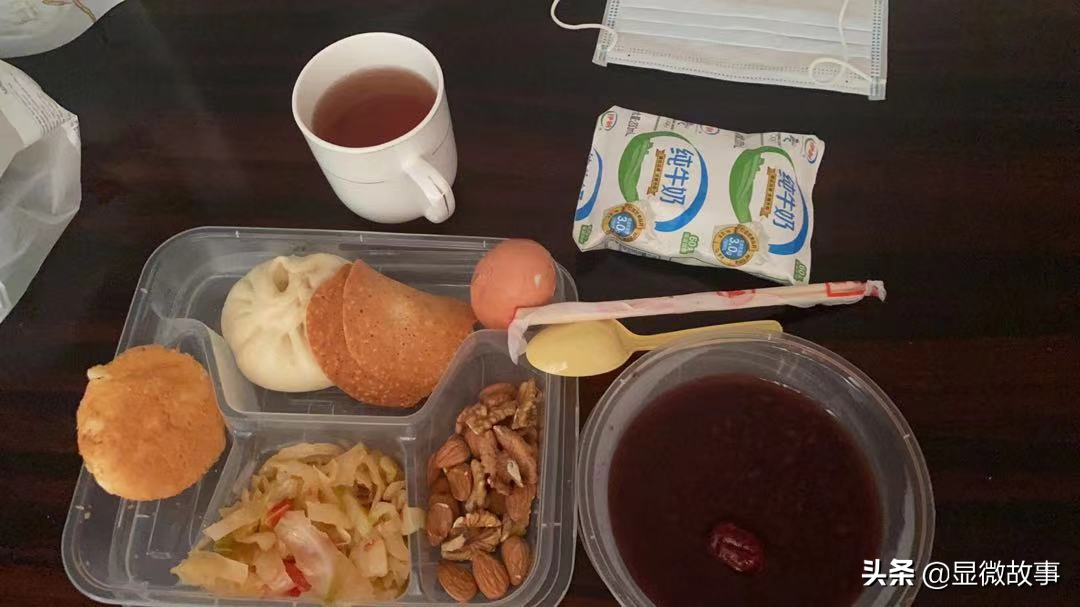 我的隔离餐算吃得还不错。一日三餐都有专人来送,分别是8点半、12点、17点。早饭能吃到牛奶、鸡蛋和馒头,午饭和晚饭有荤有素,每天都不重样,营养搭配非常均衡。
