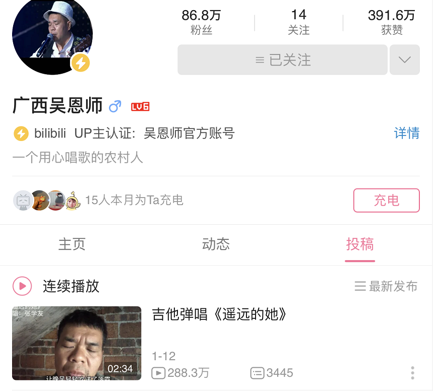 吴恩师B站账号首页,简介“一个用心唱歌的农村人”