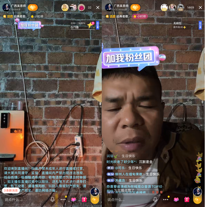 9月底,吴恩师选择告别漂泊15年的深圳,回到广西老家做一名抖音主播,“直播效果谈不上很好,但至少有人看,如果等到没有人看的那天,我说不定又回到大排档卖唱了。”