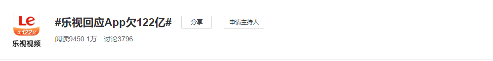 正当大家都在忙着集五福或参与其他红包活动的时候,许久没有消息的乐视视频却突然迎来版本更新。在新版乐视视频中,最显著的变化就是其全面换新的图标Logo。不过和其他几家应用宣传自己送钱不同,乐视视频Logo显示着“欠122亿”的字样,这也瞬间引发网友热议并冲上微博热搜榜。