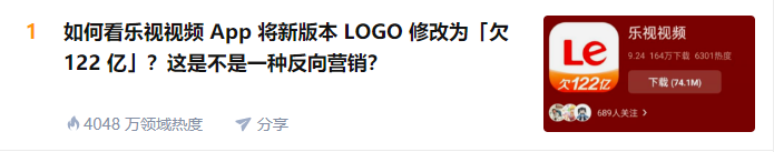 从结果来看,这次反向营销不是一般地成功。“乐视视频图标显示欠122亿”的相关话题成功占据了微博热搜和知乎榜单的首位,微博相关话题阅读量超过9450万,知乎热度达到了惊人的4048万。原本很多网友对乐视充满着厌恶之情,现在居然被这次诙谐的自嘲轻轻化解了,效果出乎意料。