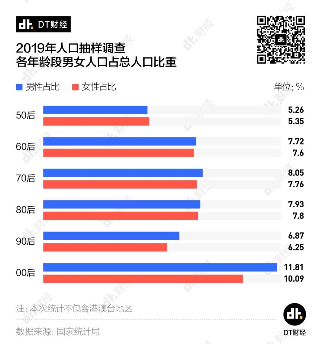 DT君通过2019年国家统计局的人口抽样调查数据算了下各年龄段的男女比例。如果你是50后~80后,还算比较幸运,男女凑合数量差不离。