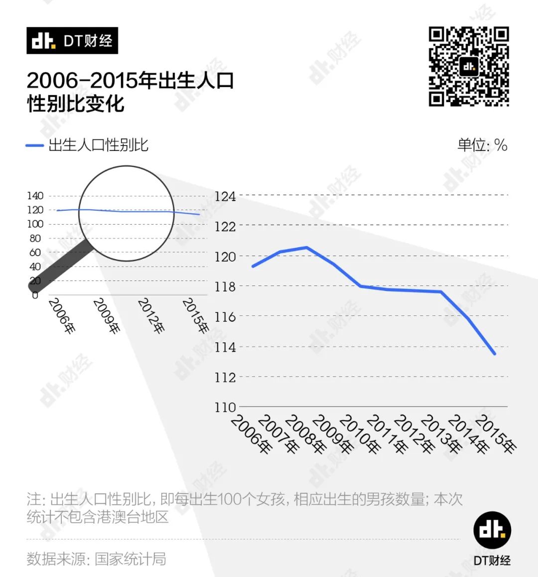 然而我国的出生人口性别比在2015年之前就没有低于过115,2007和2008年的数字甚至超过了120。这意味着什么呢?从出生开始,男孩子就比女孩子多出了至少20%。