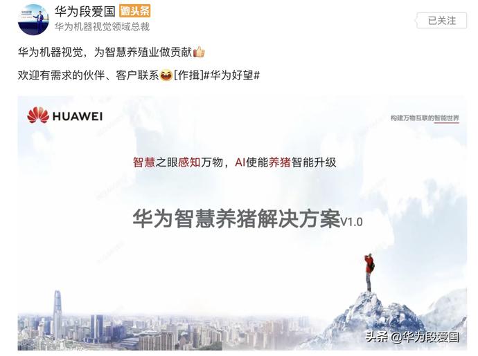 近日,华为机器视觉领域总裁段爱国在网络爆料称,华为机器视觉推出了智慧养猪方案。养殖业的发展方向是数字化、智能化和无人化。