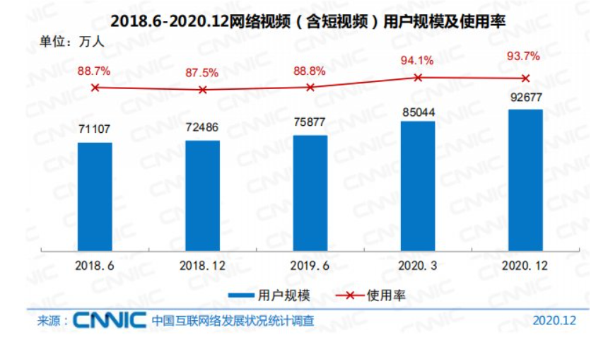 数据显示,截至2020年12月,我国网络视频用户规模达9.27亿,占网民整体的93.7%。其中短视频用户规模为8.73亿,占网民整体的88.3%。