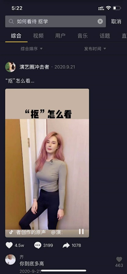 于是笔者又问了一个难一些的问题,来测试抖音是否真的理解问题以及平台视频的内容。因为最近豆瓣上的“抠抠星”很火,于是我问“如何看待看待抠学?”,它给出的第一条答案开始跑偏了,讲的是女生遇到抠的男生怎么办之类的情感教学。看来抖音算法还不懂年轻人的热词。