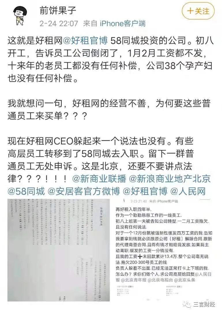 有网友称,好租公司倒闭,好租网CEO躲起来一个说法也没有,有些高层员工转移到了58同城去入职,员工无处申诉。