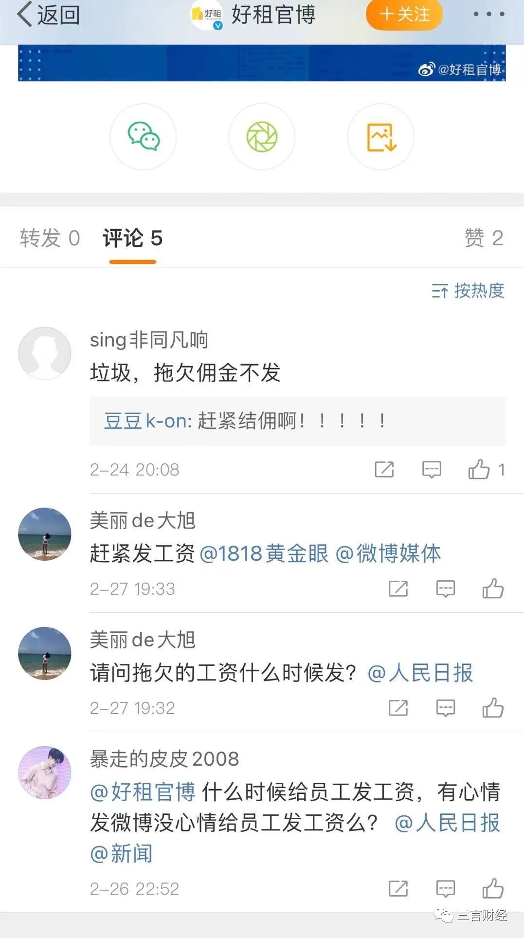 目前,在好租官博下方有不少网友称,好租拖欠工资,佣金等。