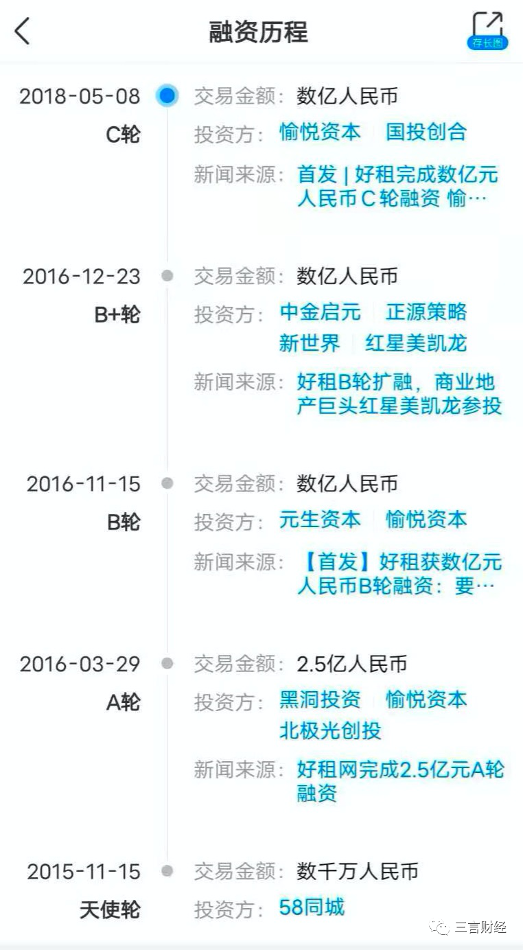 2016年12月,好租获得数亿人民币B轮融资,由元生资本领投,愉悦资本、红星美凯龙和新世界跟投。