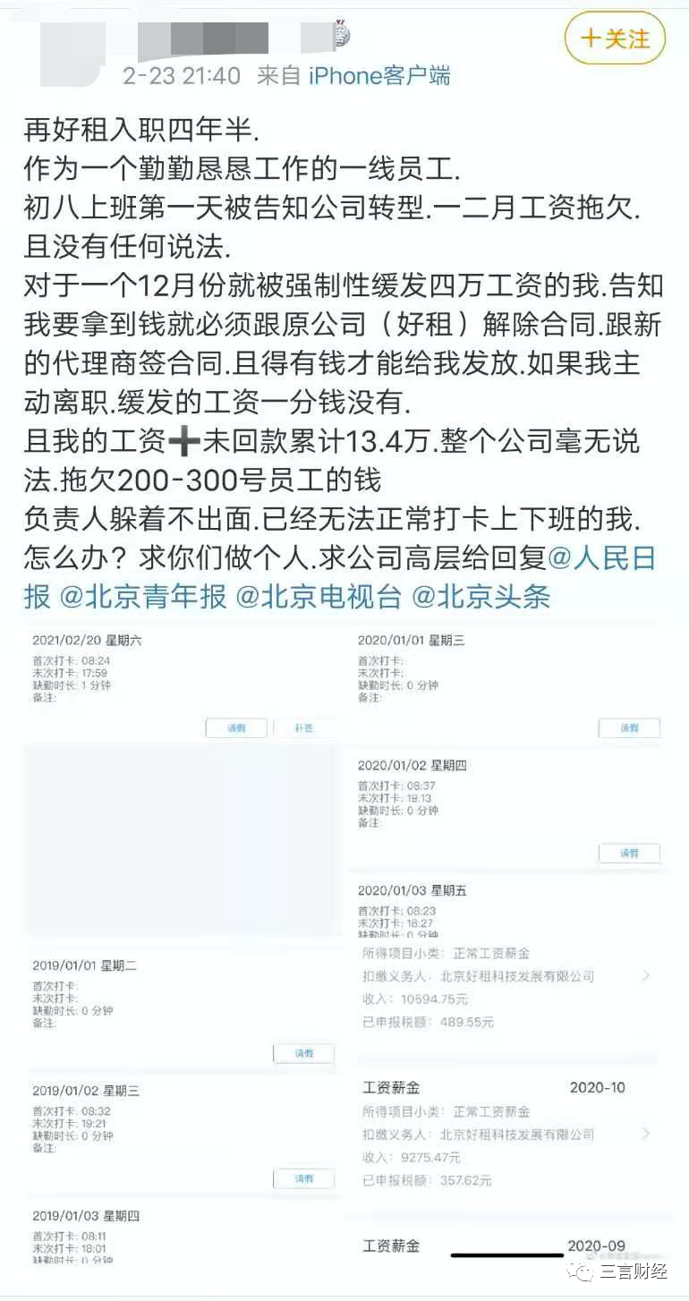 2月23日,自称好租员工的网友发文称,好租公司拖欠员工工资,解除合同若想拿到工资,需和原公司(好租)解除合同,跟新的代理商签合同,若主动离职,则缓发的工资一分钱没有。