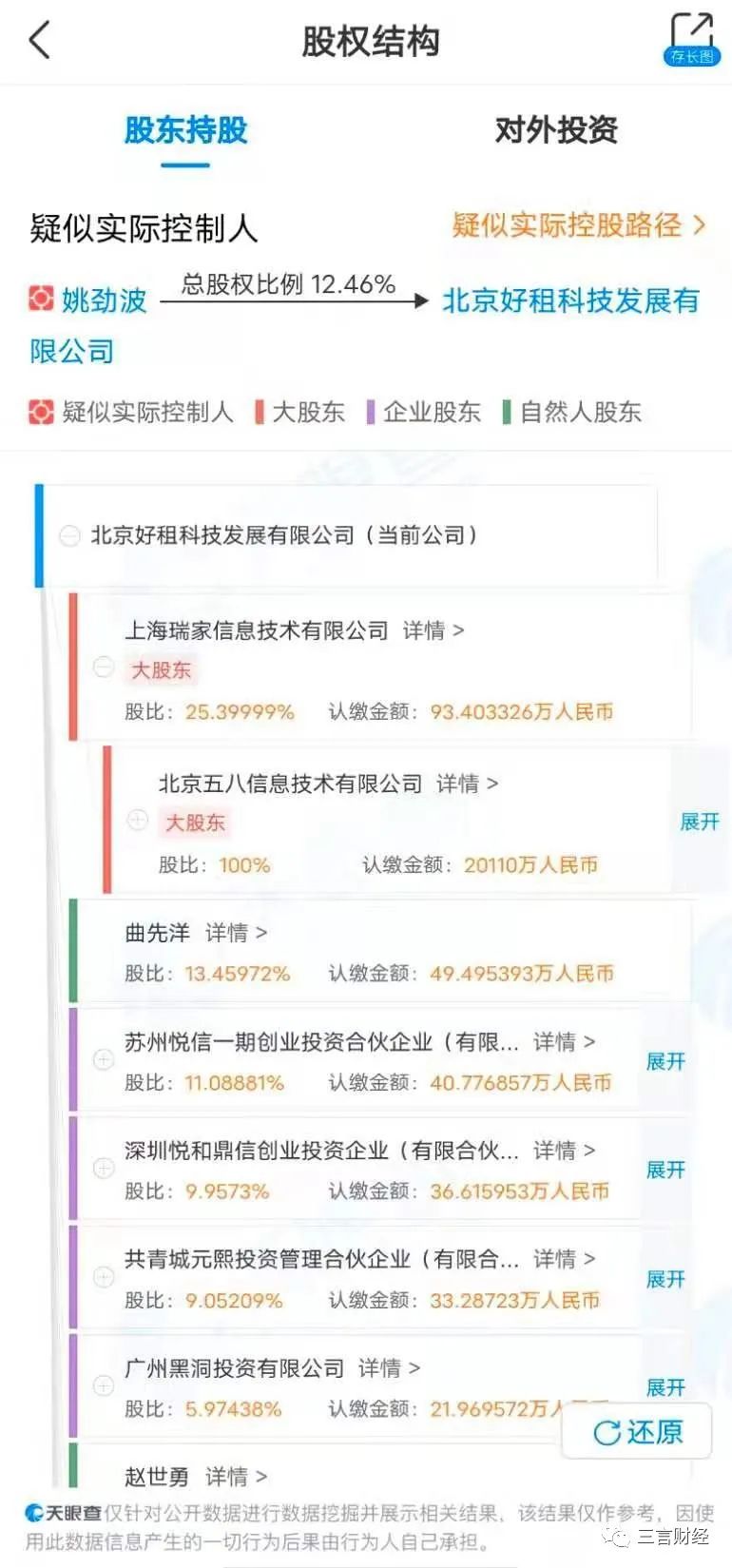 上海瑞家信息技术有限公司(安居客关联公司)持股约25.4%,北京五八信息技术有限公司100%持股上海瑞家信息技术有限公司,公司疑似控制人姚劲波,总持股比例12.46%。