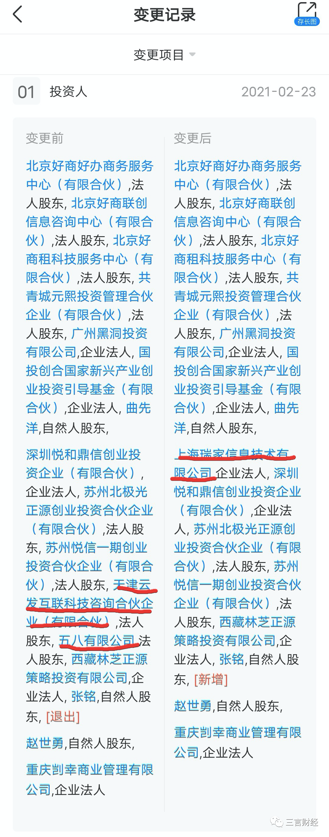 2021年2月23日,北京好租科技发展有限公司发生工商资料变更,五八有限公司、天津云发互联科技咨询合伙企业从股东中退出,新增股东(安居客关联公司)上海瑞家信息技术有限公司,持股25.4%,为第一大股东。
