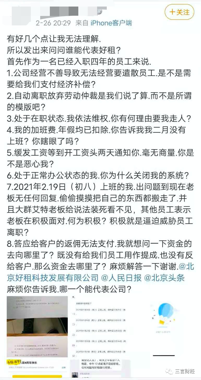 目前,针对拖欠工资、佣金等问题,好租网还未做出任何回应,三言财经将持续关注。