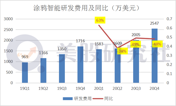 从费用角度来看,涂鸦智能2020年的业务费用扩大到了13178万美元,同比增长30%,细分费用后,发现研发费用支出最高,行政费用扩大明显,营销有关费用年度仅增加1.5%。