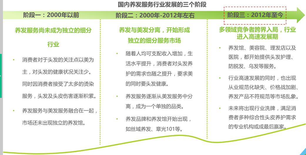 养发服务行业在我国经历了超过二十年的发展历史。2000年之前的养发服务以和美发服务融合的形态存在于理发店,尚未出现专业的养发馆。2000年之后,伴随着丝域养发、章光101等开拓专业养发这块空白市场,养发开始与美发分离,逐渐形成了独立的细分服务市场。2012年之后养发服务市场进入到了高速发展的阶段,特别是在2014年之后,养发服务市场可以用“陡峭式“发展来形容。