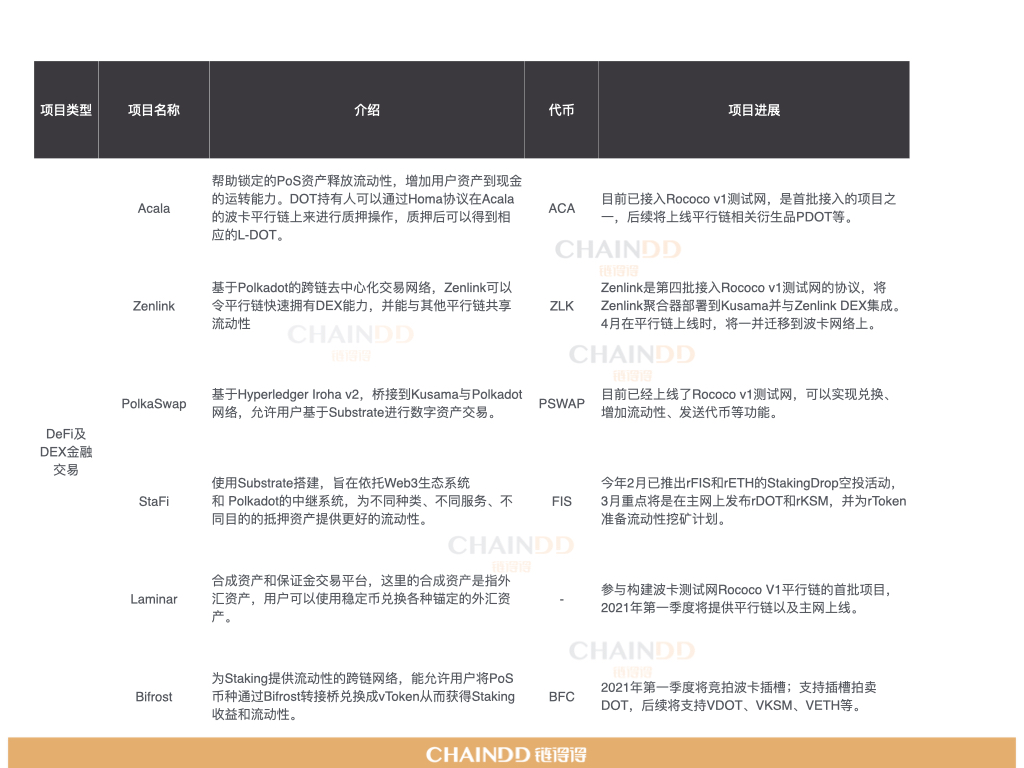 1月10日,波卡社区在twitter上发消息,说目前有8个项目准备参加波卡的平行链插槽拍卖,分别是Kupulu、Stafi、Robonomics、Darwinia、ChainX、Sora和Crust。据链得得App不完全统计,目前公开宣布竞拍波卡平行链插槽的项目已经超过20多个,其中有关DeFi和DEX相关金融类解决方案占据大多数,此外还包括跨链桥资产解决方案以及少部分存储类项目。