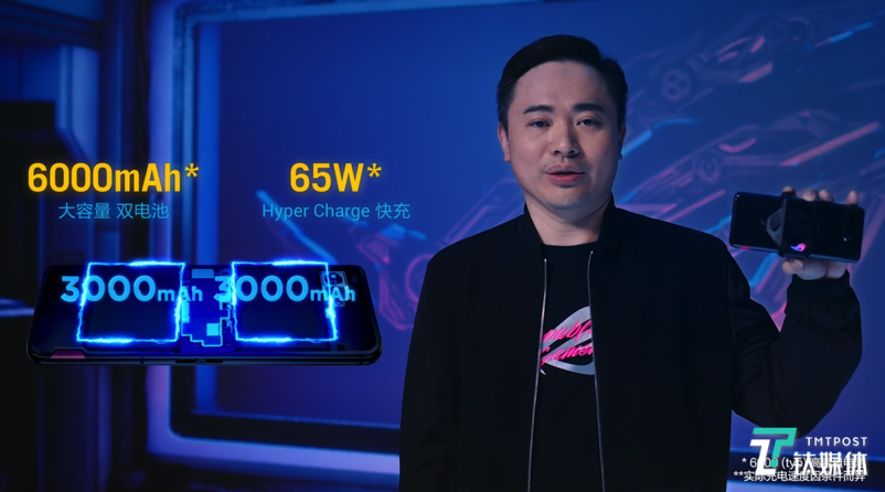电池方面,腾讯ROG游戏手机5搭载6000mAh大容量双电池,支持65W快充。在横屏游戏过程中,定制侧边居中接口可在不影响游戏体验的情况下为手机提供动力,旁路充电设计允许玩家设置仅对系统供电,停止对电池充电。