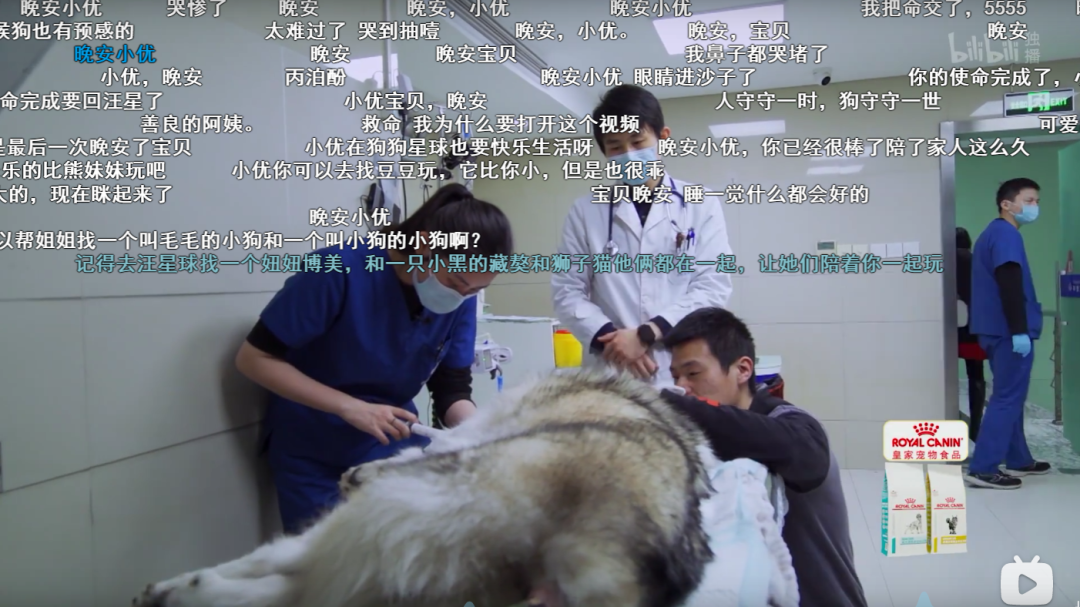 那针让二哈熟睡的液体推进它的身体里的时候,很多人在B站的弹幕上打下了他们去世的宠物的名字,“晚安,小优”,“下次在回来找妈妈和哥哥啊”,“记得去汪星球找一个叫妞妞的博美”,“帮我照顾好汤圆弟弟,他是一只温柔的萨摩耶”,“晚安,宝贝”。