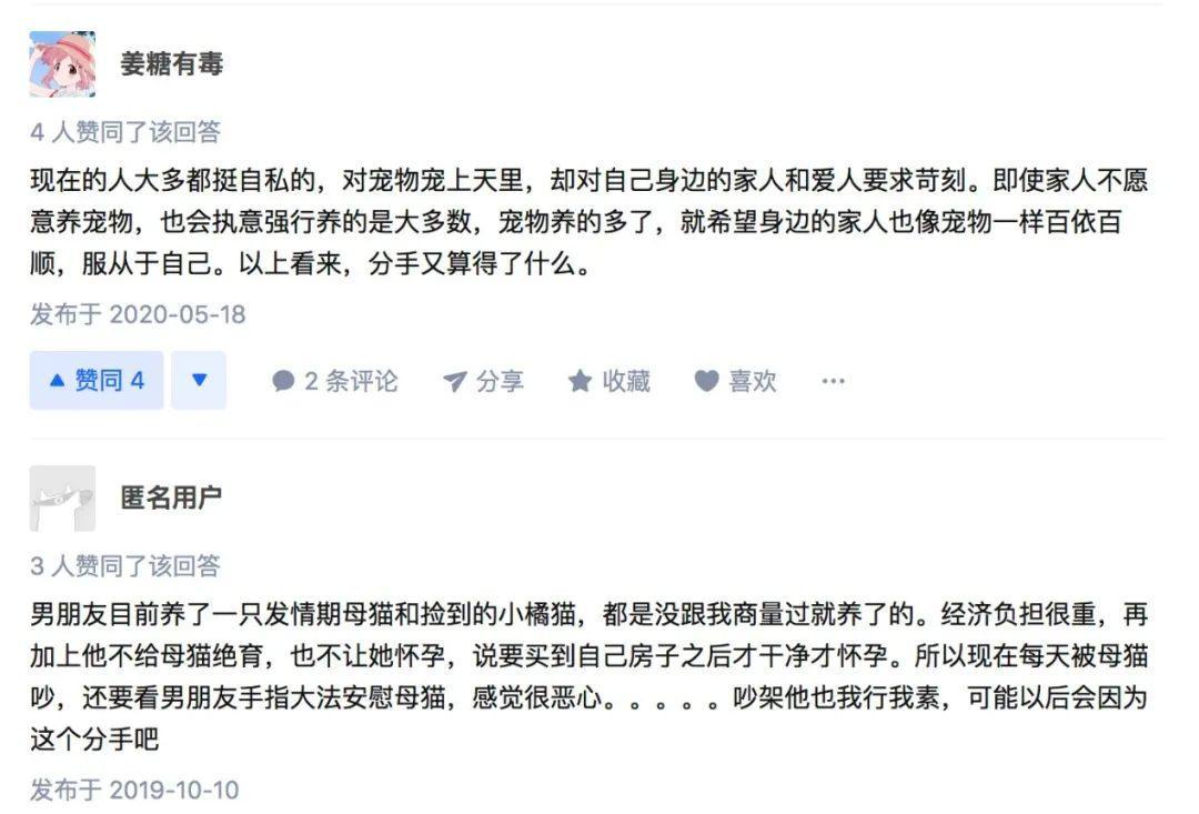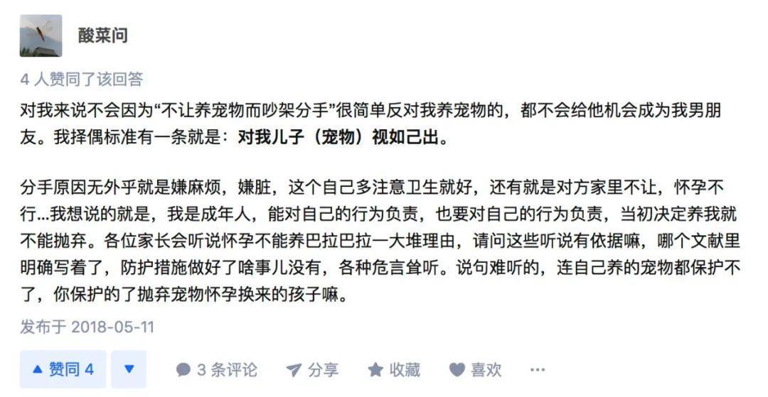 在知乎上,“有没有因为养宠物而吵架分手的?”,有人表示如果男朋友不能接受宠物,就不结婚。